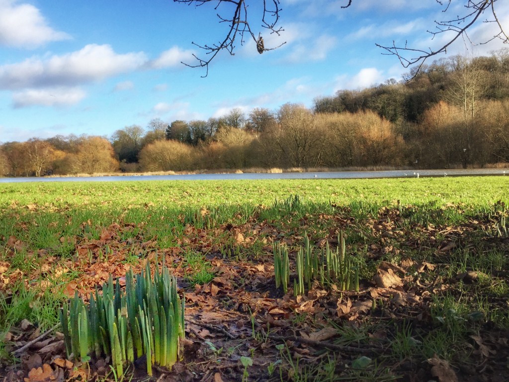 This meant that one of our regular circuits was not possible but it was still an enjoyable walk, rewarded at the end by the sight of daffodils pushing through the wet ground and the remaining autumn leaves.