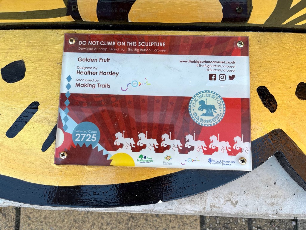 Heather Horsley’s Golden Fruit is enhanced and almost seems to be ripened by the evening sun outside Burton Town Hall. Heather gives no clues as to the inspiration behind the use of fruit but it is very much in the style she uses in much of her published work and greetings cards.