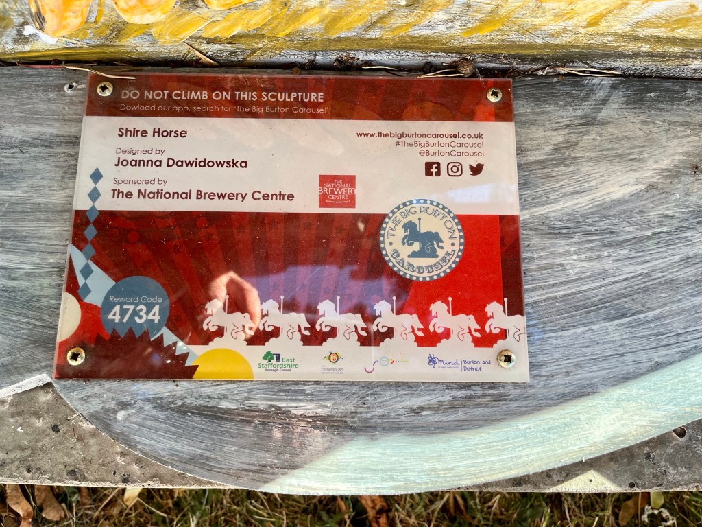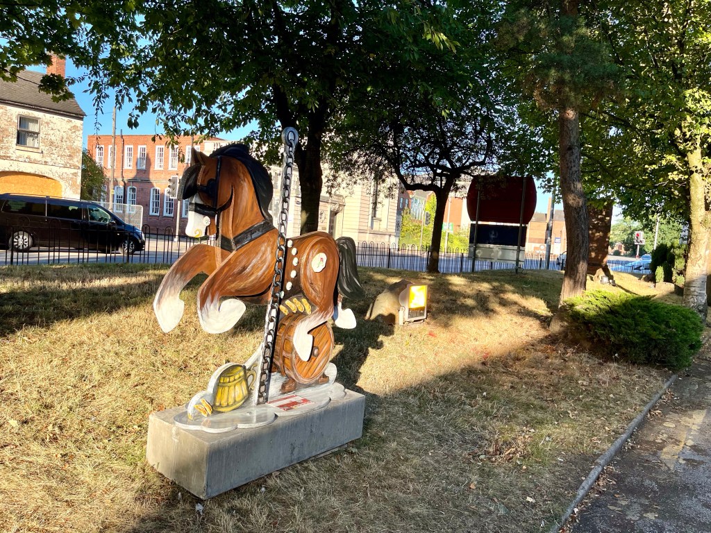 These horses look very much at home in their allocated settings. Firstly, Shire Horse at the National Brewery Centre. Shire horses were traditionally used to pull brewers drays for the delivery of beer back in the days of wooden barrels. This one, designed by Joanna Dawidowska includes a reference to two key ingredients in beer, hops and barley.